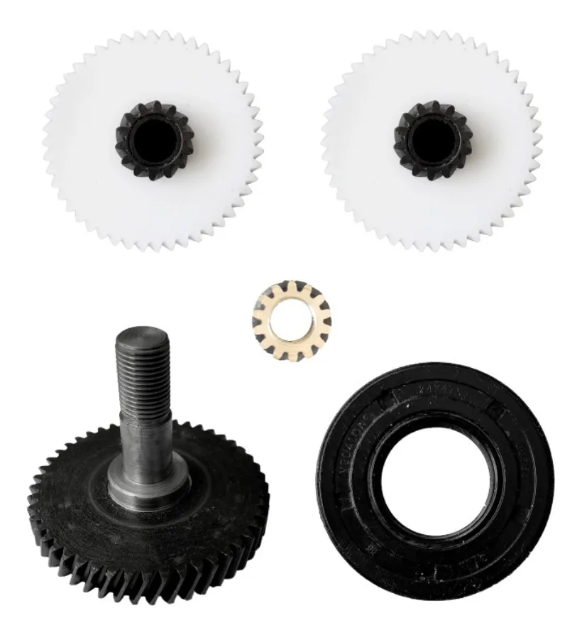Kit de engrenagens para enceradeira industrial modelos 400/500, compatível com equipamentos das marcas Deep Clean, Romher e Cleaner. Conjunto desenvolvido com materiais de alta resistência, combinando engrenagens em nylon reforçado e componentes metálicos para garantir máxima durabilidade, transmissão eficiente de força e funcionamento suave do equipamento.